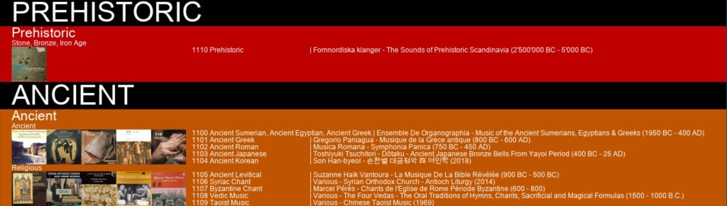 Moving through to the Ancient section, Music of the Ancient Sumerians, Egyptians & Greeks combines various musical hymns, pieces, fragments and excerpts performed by the Ensemble de Organographia; some intriguing pieces here, with some equally intriguing sounds/instrumentation. It is even moreso on Musique de la Grèce antique (Gregorio Paniagua) and Symphonia Panica (Musica Romana), another favorite so far, with Musica Romana utilizing two pan flutes found and reconstructed alongside harps, lutes, and reed instruments with original and replicated music, creating a very nice and cohesive record [1].